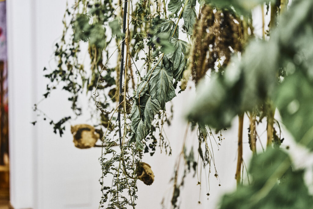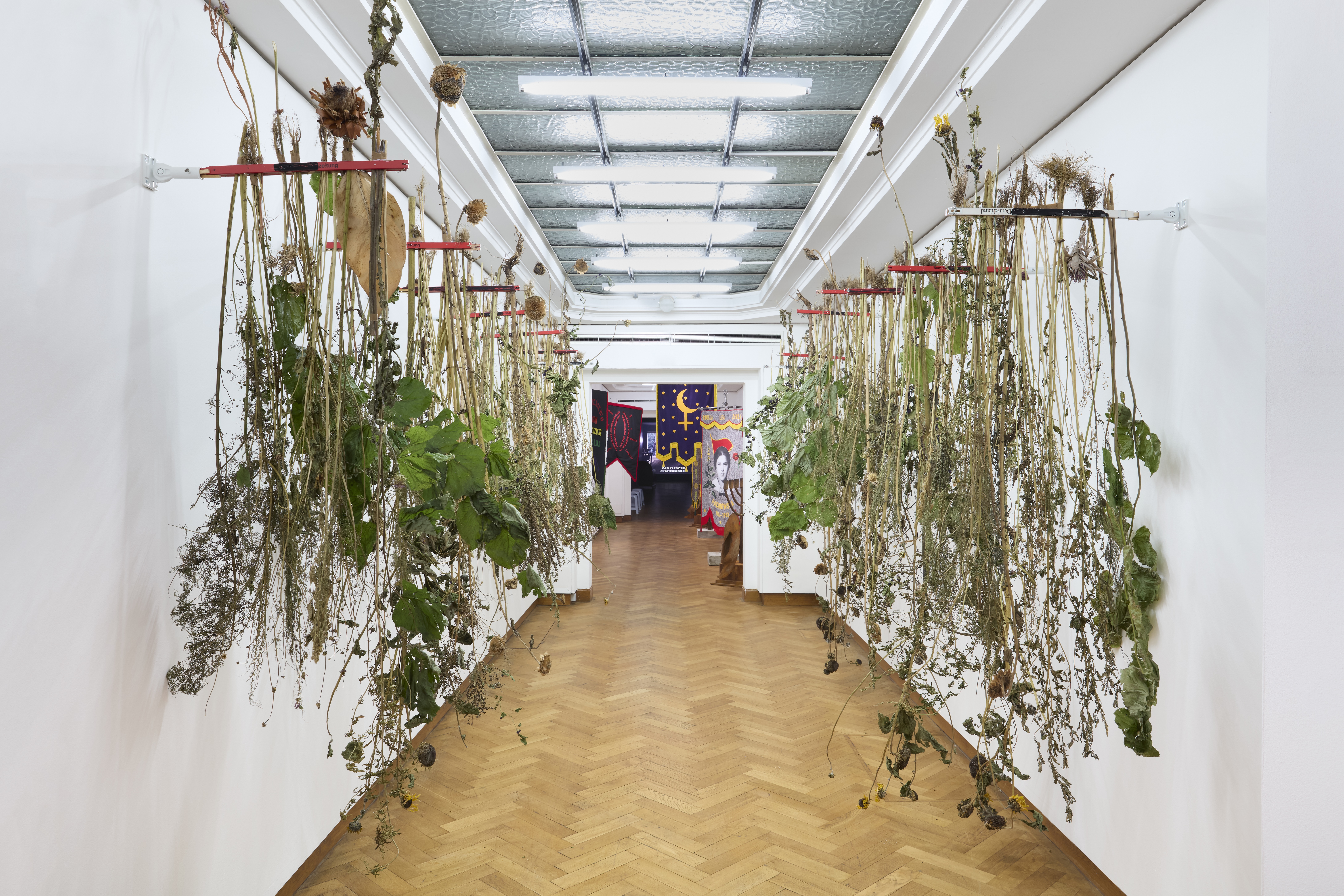 forgotten, also because she considered nationalism as a violent tendency. Artist Renata Rara Kaminska (lives in Berlin), who shares Luxemburg’s birthplace, the city of Zamosc has devoted a number of artworks to the revolutionary. The installation presented here refers to Luxemburg’s herbariums made during her years in prison in Wrocław shortly before her death. The herbarium becomes the garden Luxemburg always wished for and never managed to have. Miedza is full of dried flowers, weeds and wild plants that Luxemburg, and the artist after her, have been collecting such as thistles, nettles or trefoils. They pay tribute to the act of growing despite all odds, refusing to be unnecessary, keeping on going. Wild plants, which are often considered as uninvited guests, can in fact be essential in healing